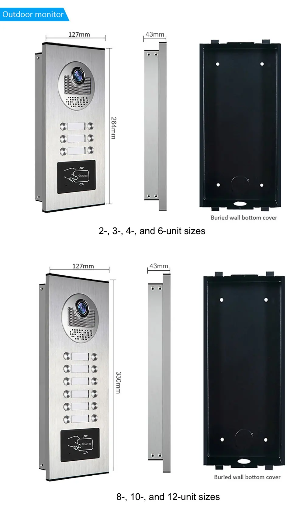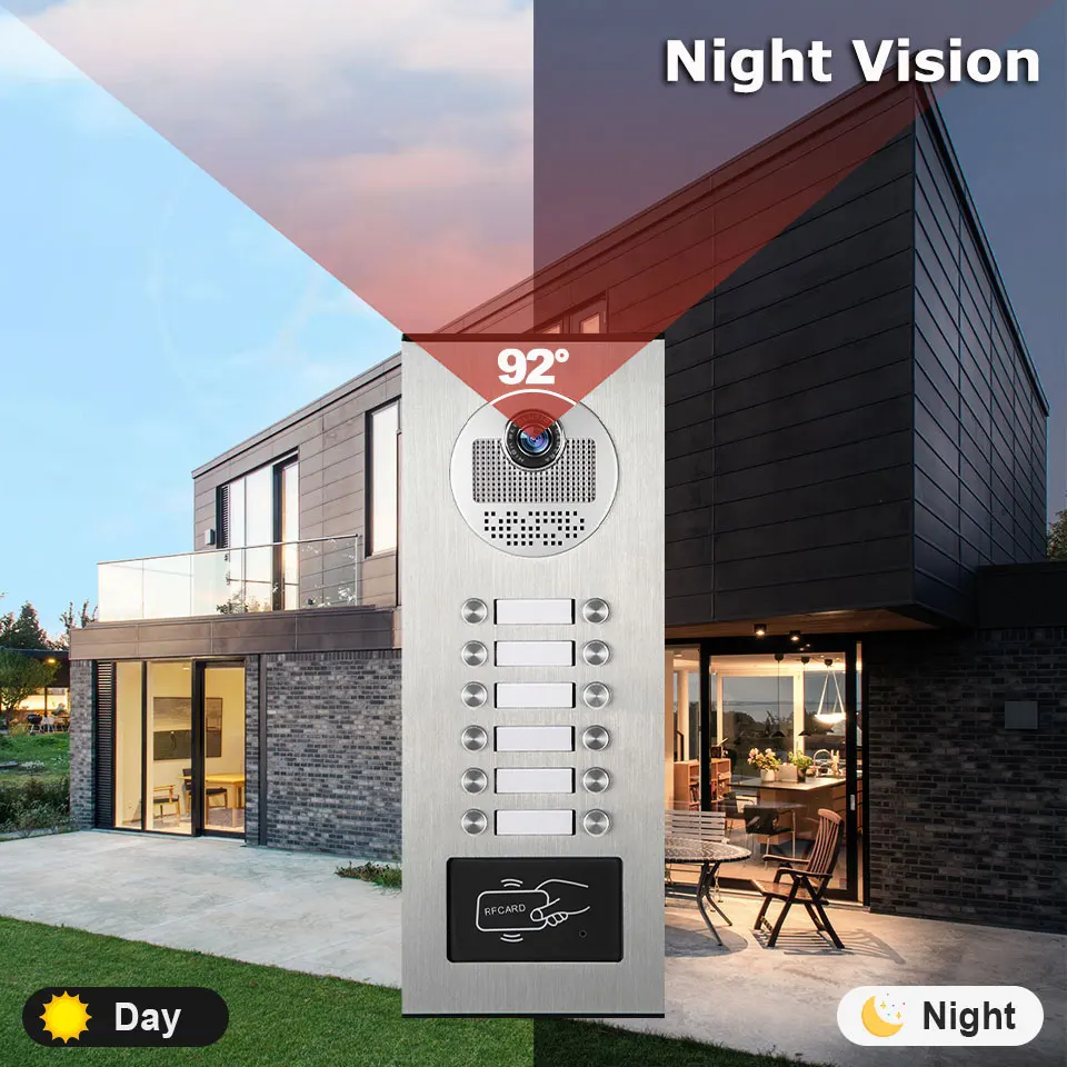 The outdoor camera has 2,3,4,6buttons, each button can control a monitor independently. This is a high quality device with reliable system performance, perfect function, and flexible configuration. The ourdoor camera build-in a RFID reader, with this function, you can open your door with the RFID key card from outside. Item support 500 user cards.Can be used for multi apartments, especially suitable for low-rise buildings,don't need to connect to internet!