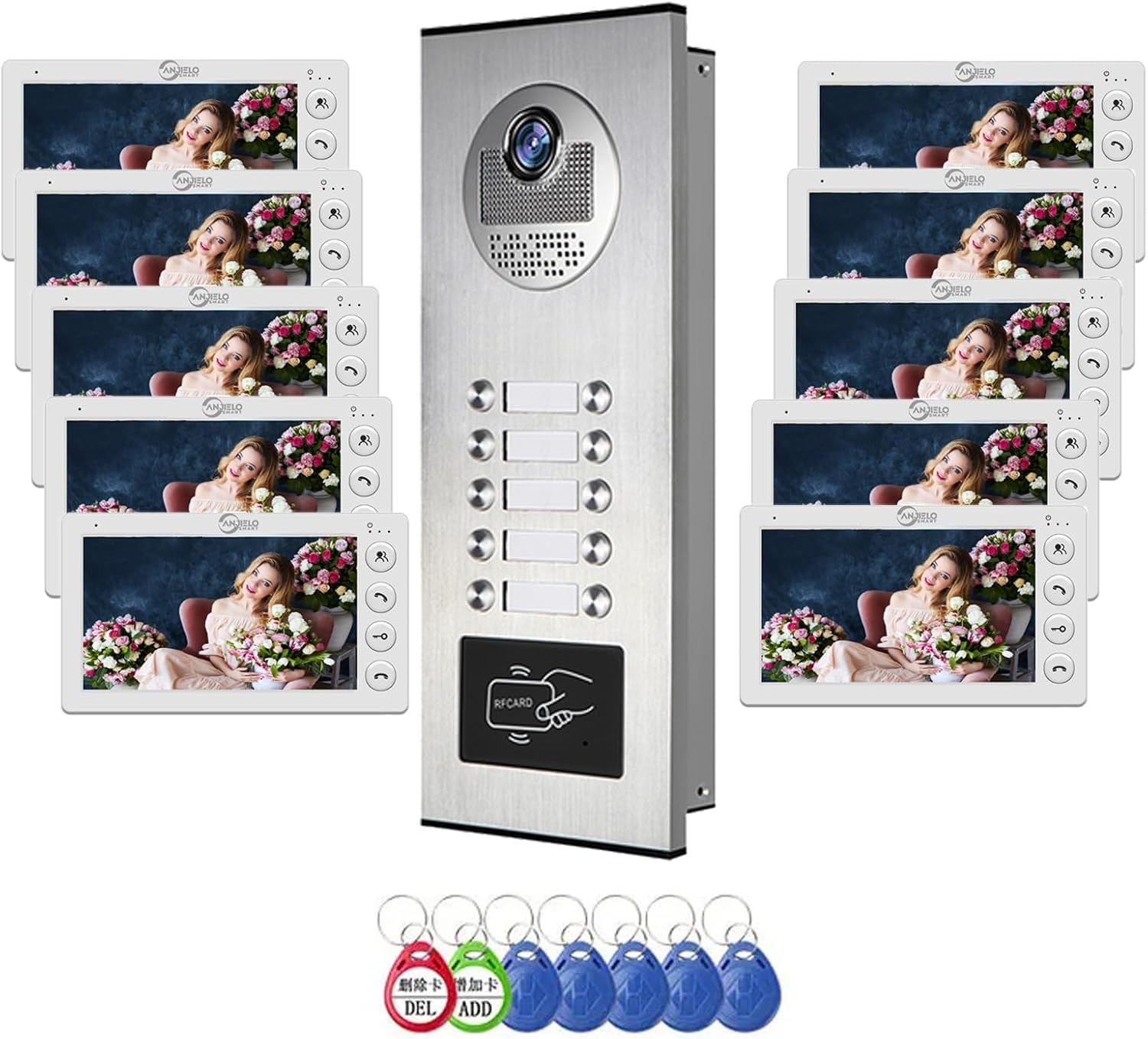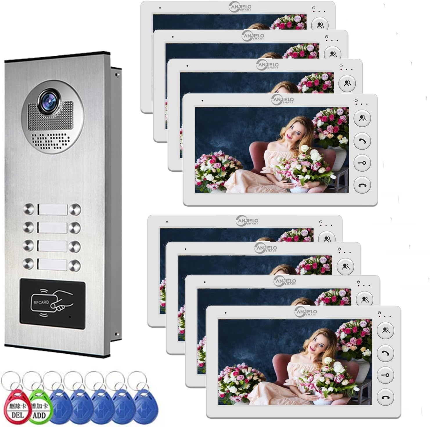 Video Apartment Intercom System,8 Units 7 inch Monitor Wired Video Door Phone Kit,Indoor Outdoor Video Doorbell, ID Keyfobs Unlock, 2 Way Audio, 8-Screen for Home Apartment